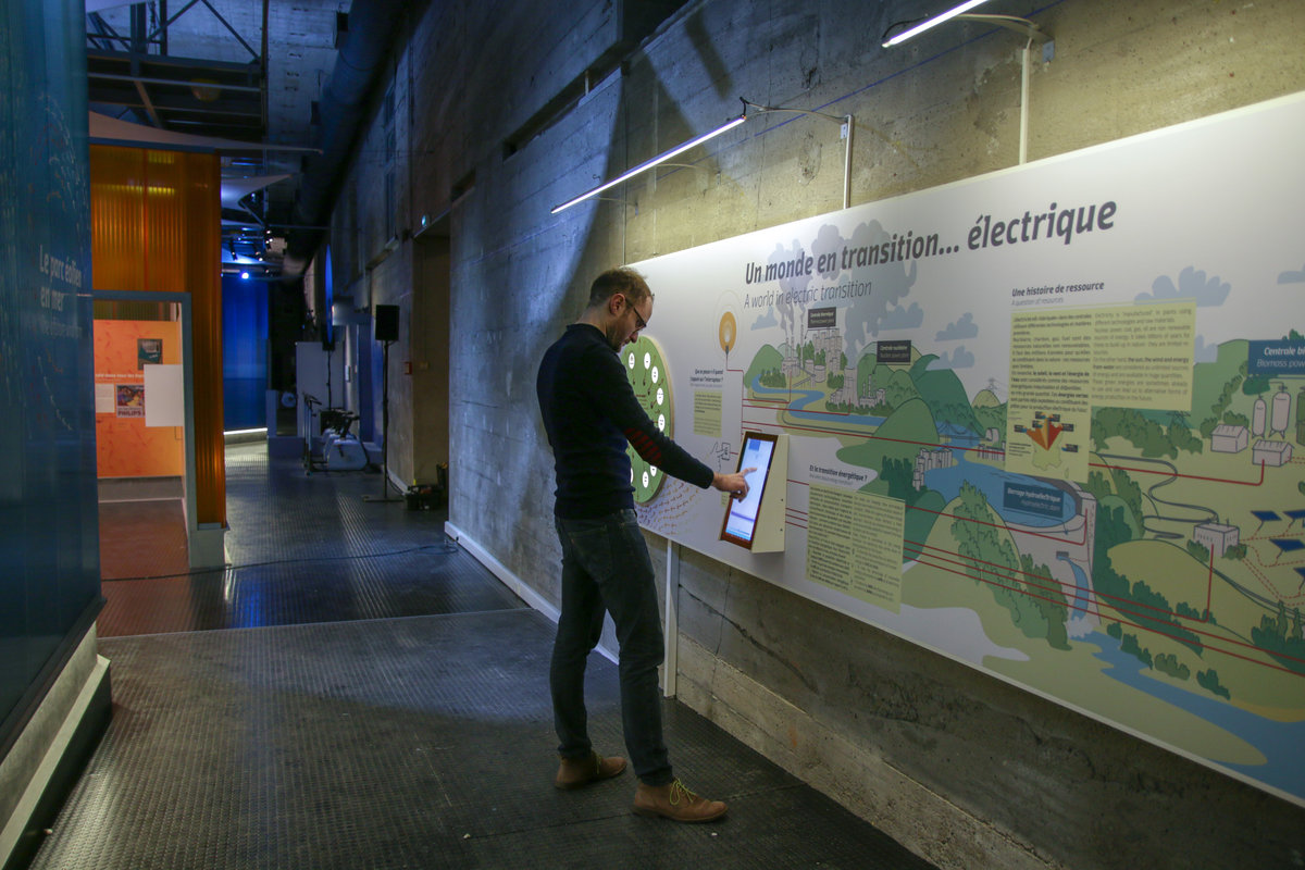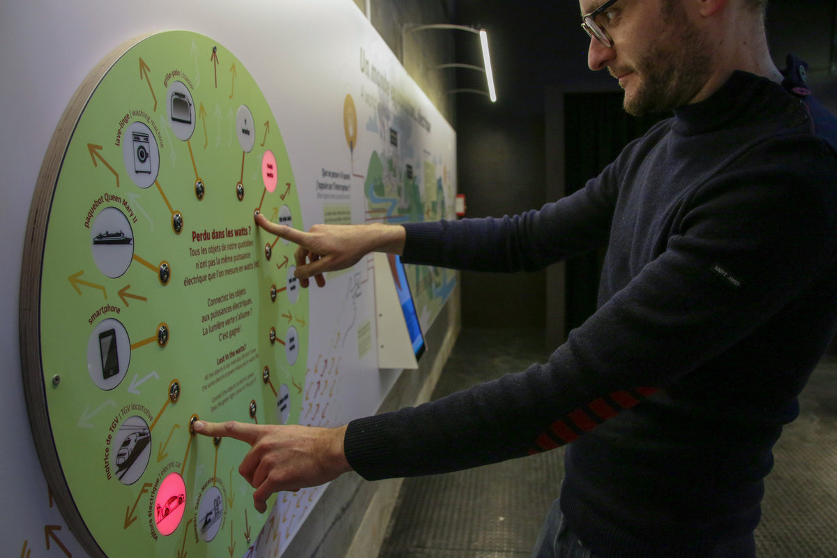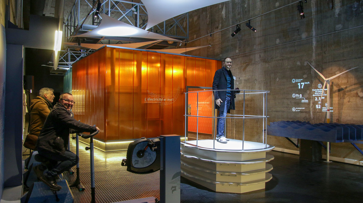 On aborde ensuite la façon dont l’électricité a envahi notre vie quotidienne, l’industrie, les transports, nos villes… Dans son cheminement, le public traversera un espace où s’expriment, via de courtes interviews, les femmes et les hommes qui œuvrent pour les métiers de l’éolien : une prodigieuse aventure humaine et technologique. Des tables tactiles permettent au visiteur de s’initier à la conception d’un parc éolien offshore ou de suivre en direct les étapes de la construction du futur parc.