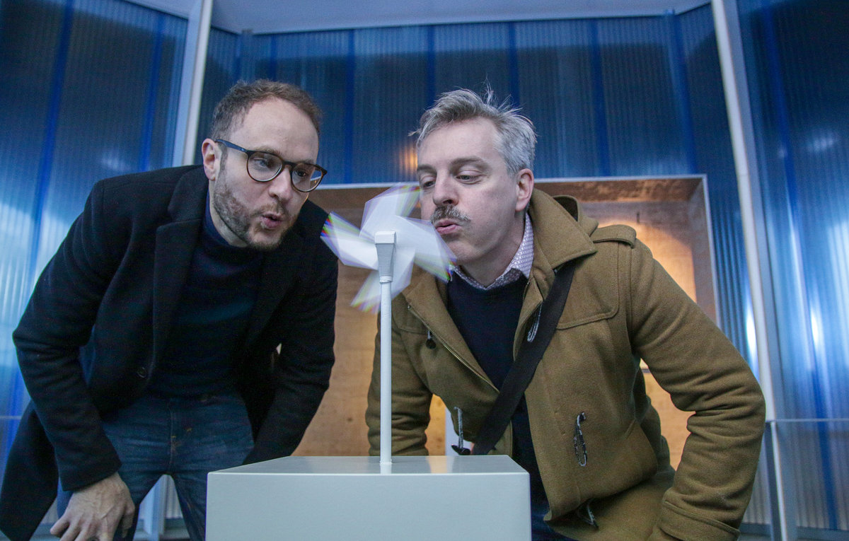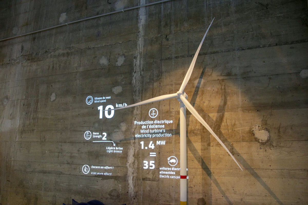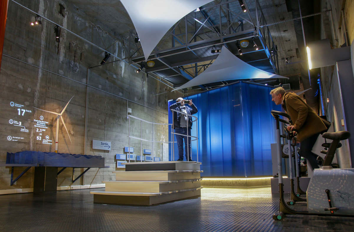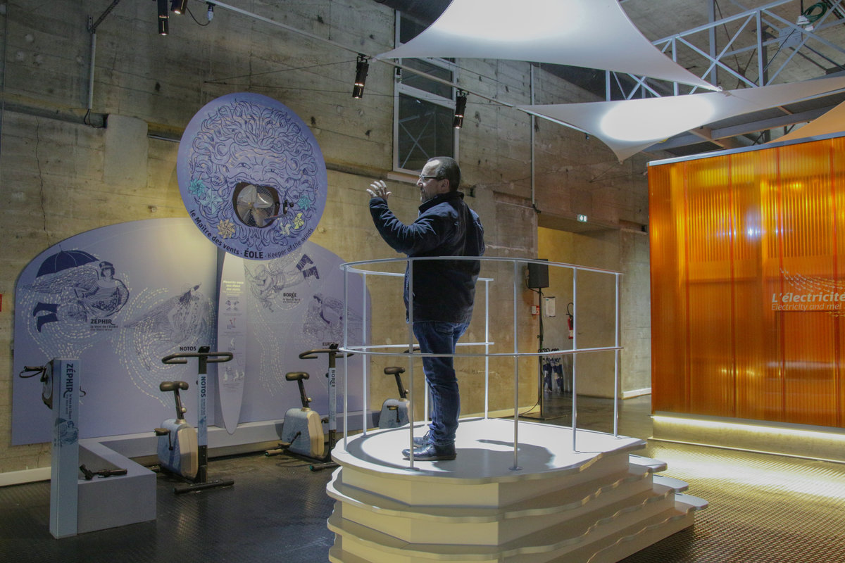 Ici, on apprend en s’amusant ! C’est le dieu grec Éole qui donne le 1er souffle à ce parcours interactif, ludique et immersif : c’est lui qui nous narre de façon goguenarde et poétique l’histoire de l’utilisation du vent par les hommes… Ensuite, le visiteur peut s’amuser à expérimenter physiquement et mesurer la force du vent : une soufflerie actionnée à la force du mollet produit un courant d’air transmis par un anémomètre à un ordinateur et qui actionne une maquette d’éolienne. S’affichent la vitesse du vent ou l’énergie produite par l’éolienne, etc.