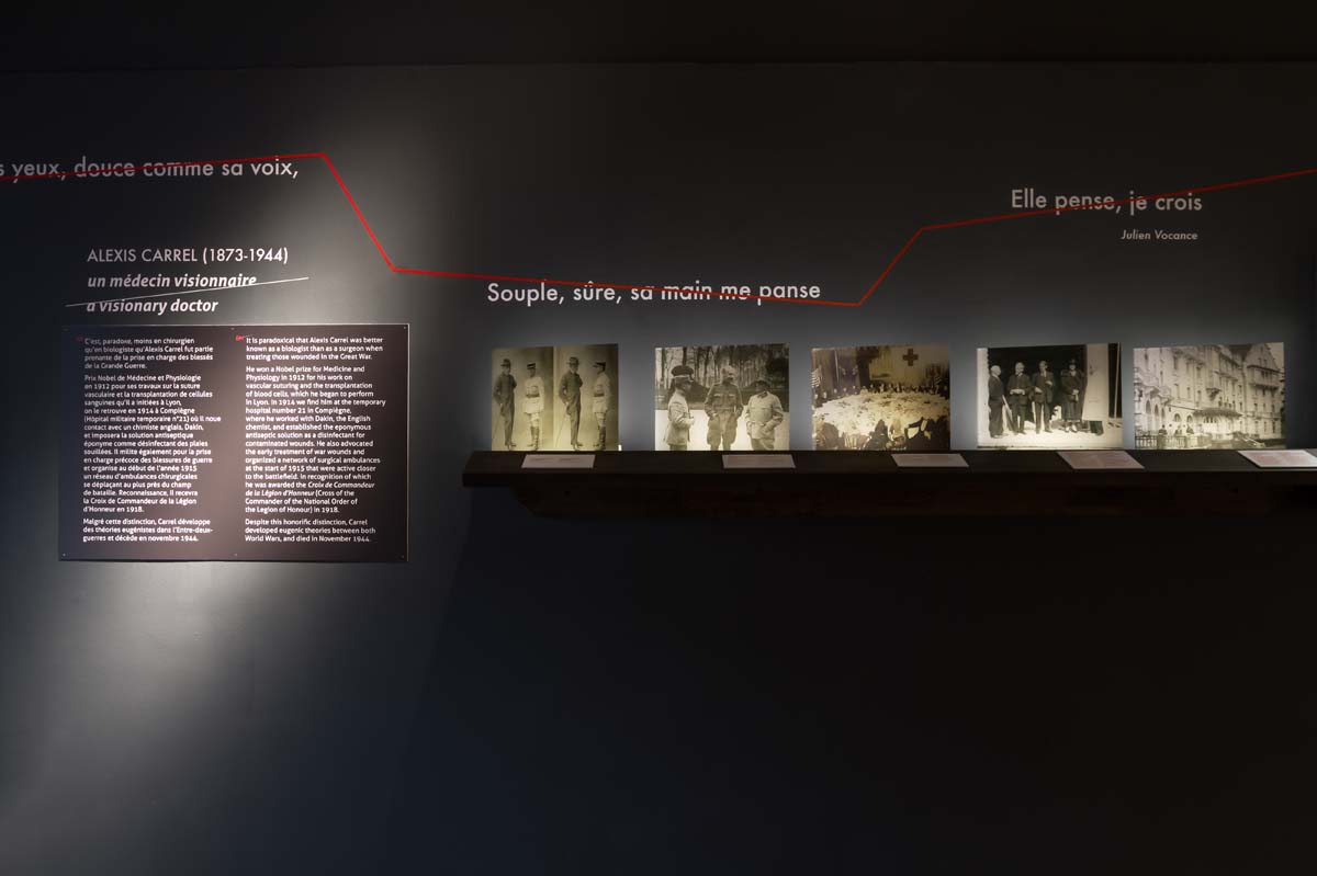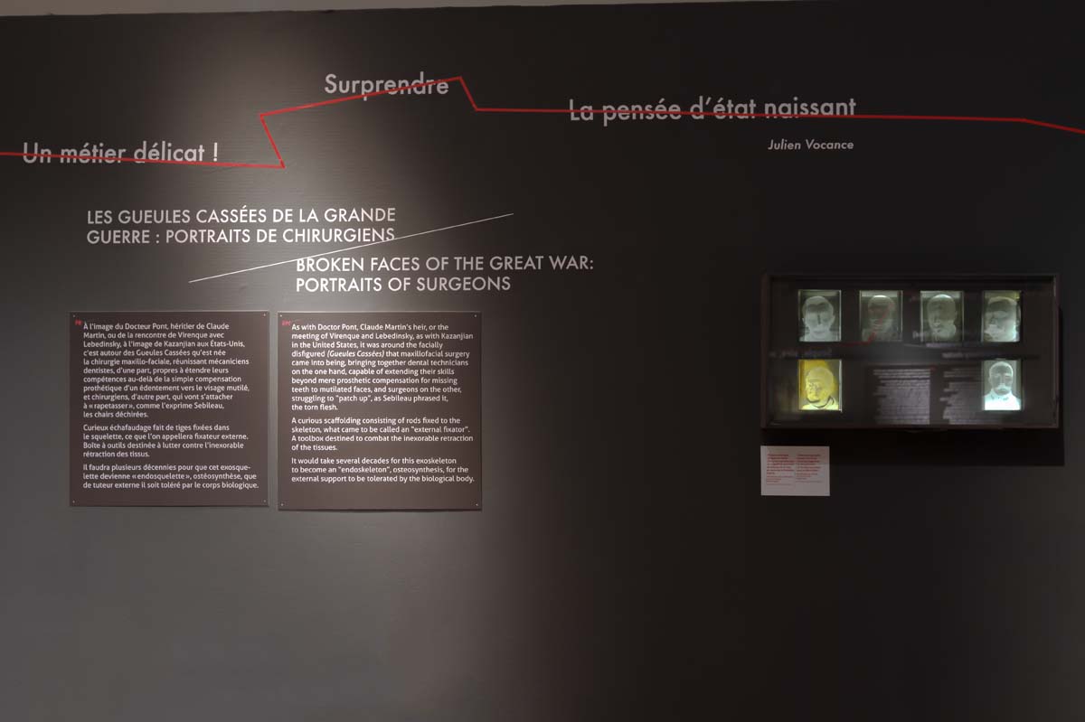 Notre défi pour cette exposition temporaire a été de mettre en place un parcours de visite et une scénographie qui médiatisent le contenu et permettent aux visiteurs d’être interpellés, sensibilisés, émus, interrogés pour oser porter un regard sur la défiguration, celle née de la grande guerre, mettre en miroir l’impensable défiguration que la malformation à travers une ligne de mobilier contemporaine jouant sur les brisures du miroir, sur la fragmentation et la blessure et la cicatrice.