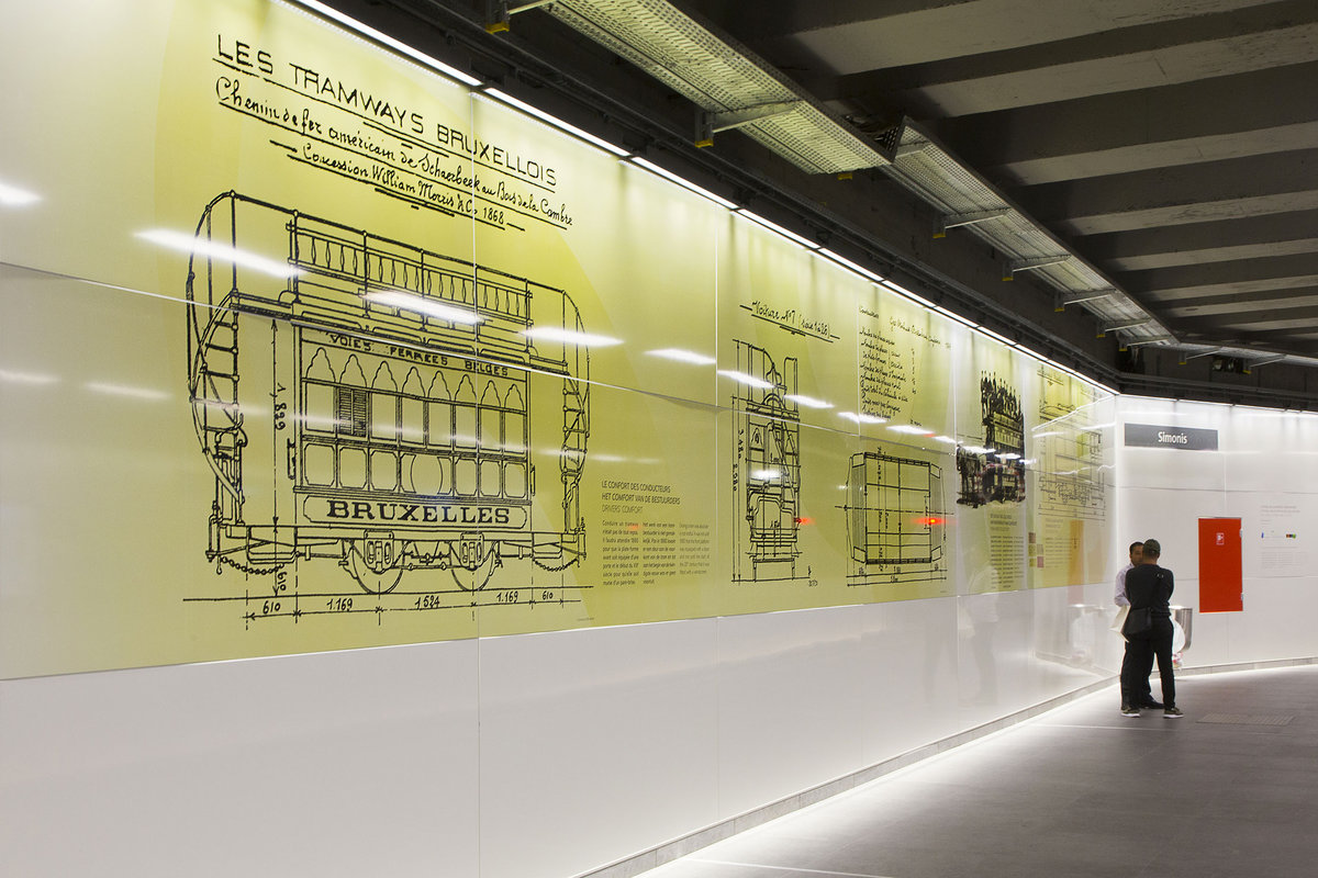 Ici commence le voyage ! Grâce à un nouvel habillage scénographique et graphique imaginé par l’agence Kascen à la demande du service public de la mobilité de Bruxelles-Capitale et de la Société des transports bruxellois, 2000m2 de panneaux de tôle émaillée proposent aux usagers des transports une déambulation, entre quais et couloirs de liaison, dans l’histoire du tram et des transports à Bruxelles, ainsi que l’impact du développement des transports dans l’évolution du quartier où se situe la station Simonis. De grands visuels reprenant des images d’archives recolorisées y sont déployés et se conjuguent avec des citations d’auteurs tels Jacques Brel ainsi que des récits d’anonymes.