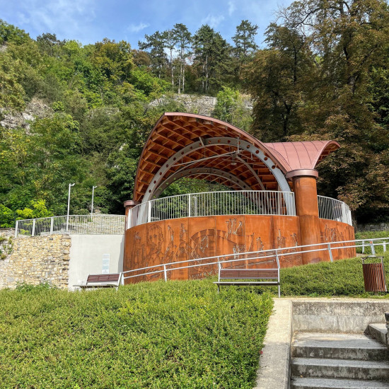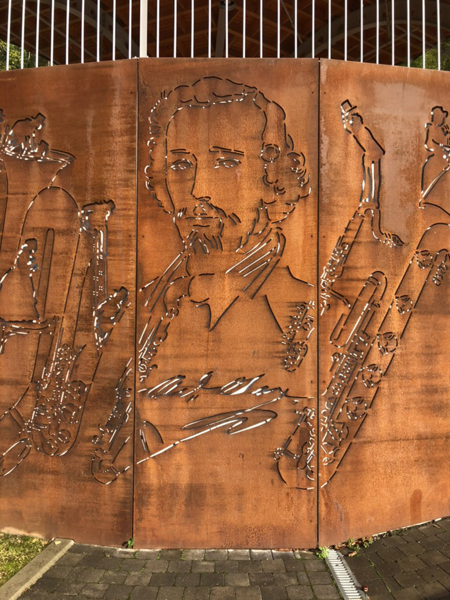 Adolphe Sax, natif de Dinant, est le génial inventeur de nombreux instruments de musique dont l’incontournable saxophone. Ce kiosque à musique situé au centre-ville rend hommage au génie créatif de cet illustre dinantais. Une fresque graphique découpée dans la tôle d’acier Corten rappelle les inventions fantasques, les caricatures dont Sax faisait l’objet et les réactions outragées de l’époque. Cette grande illustration tourne tout autour de l’architecture pour habiller tout le sous-bassement. À la nuit tombée, les découpes s’illuminent pour révéler encore davantage la créativité dinantaise.
