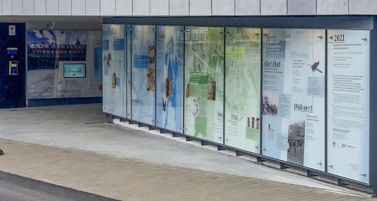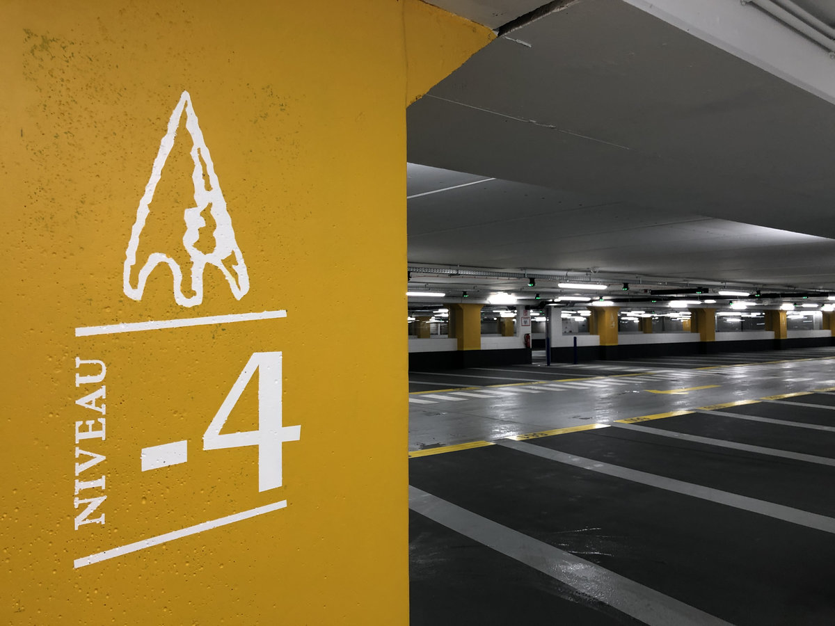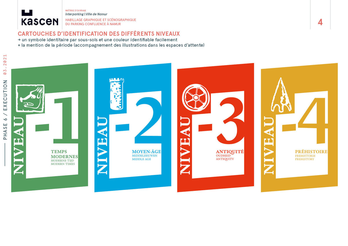 Le plus court chemin entre deux points est la ligne droite : encore faut-il pouvoir s’orienter ! Une petite signalétique bien pensée vaut mieux qu’un grand discours Au cœur de Namur, le Parking du Grognon bénéficie d’une signalétique claire et ergonomique, conçue et réalisée par le studio graphique de Kascen. À chaque étage, correspond une période de l’histoire de la ville et l’automobiliste remonte ainsi le temps en quelques cases de BD bien placées, guidant son orientation tout en l’éclairant sur l’histoire de la ville et du site.